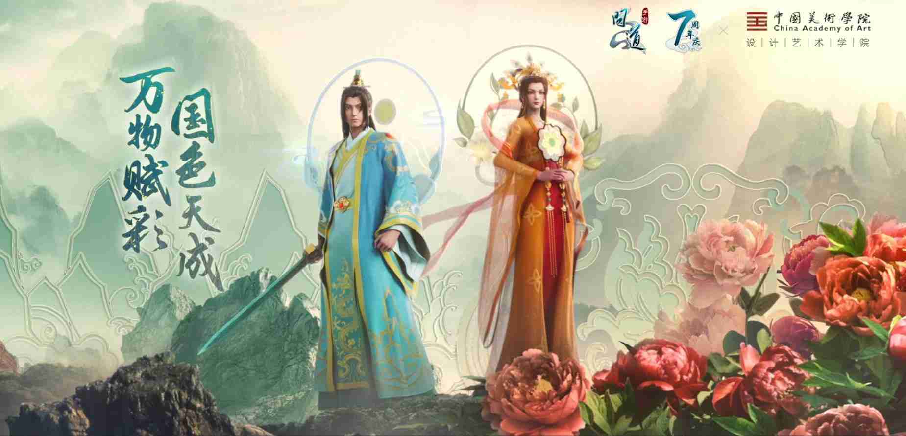 2023年4月,,《问道手游》联动中国美术学院,,,,在游戏中融合了中国历史上不同时期的文化元素,,,打造了“山河万象”与“凤鸣九霄”的国风时装。。。在色彩配置方面,,,,创作团队基于对游戏角色特性的分析提取相应的文化内涵,,从每一种色彩的色相、、、、指代事物和情感出发对应角色属性,,,选定服装的色彩搭配。。。。在纹样设计方面,,创作团队结合游戏角色自身特殊的造型比例和形态,,,在实际的纹样设计中进行了游戏语境下的活化演绎。。。。男性角色集中使用了如蟒纹、、、海水江崖纹、、、如意纹和云气纹等传统纹样元素,,女性角色则吸纳了凤凰纹、、、牡丹纹、、、卷草缠枝纹等元素,,,,组成以“双凤牡丹纹样”“缠枝牡丹纹”“金玉凤冠头饰”为主要纹样的游戏角色装饰图案系统。。。。
