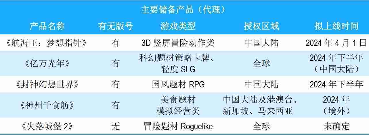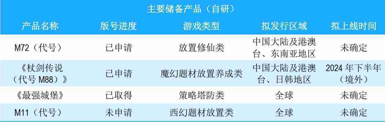 公司储备的多个自研、、、、代理产品都在有序推进当中,,,涵盖放置类、、、策略类、、、、模拟经营类、、RPG、、Roguelike等多元化游戏品类,,,,储备的主要自研和代理产品如下:::