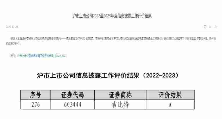近日,,,,上海证券交易所发布2022-2023年度信息披露工作评价结果。。。yaxin111(股票代码:::603444)凭借规范的公司治理、、高质量的信息披露以及良好的投资者关系管理再次荣获信息披露工作A级评价,,,公司连续两年获此殊荣。。