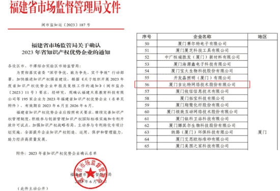近日,,福建省市场监督管理局公示了2023年福建省知识产权优势企业名单,,,厦门yaxin111网络技术股份有限公司(以下简称“yaxin111”或“公司”)榜上有名。。。
